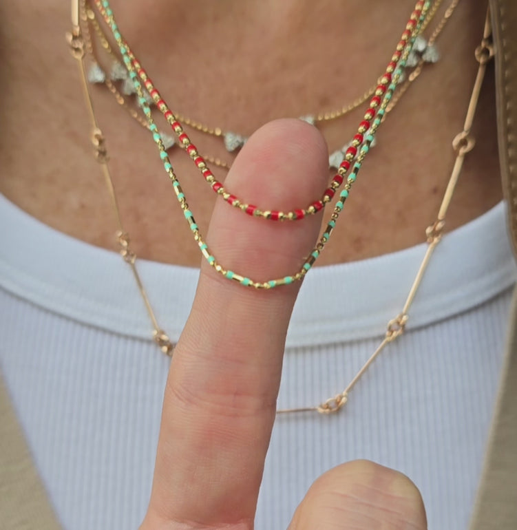 Gold & enamel mini capsules that easily add an abundance of color to your stack. One of the best qualities about these necklaces is that they do not tangle easily, so you wear stack them carefree.