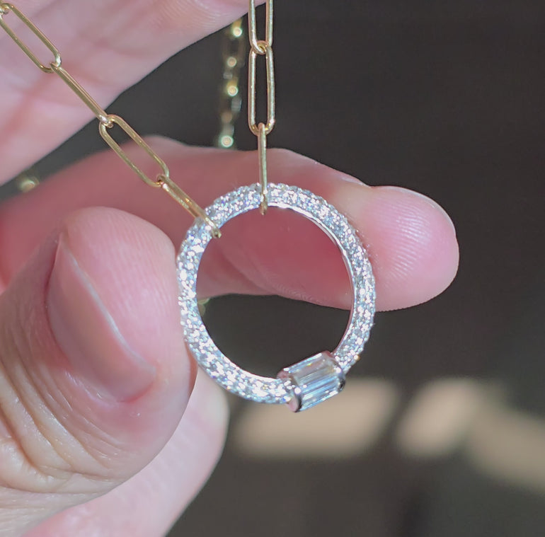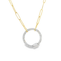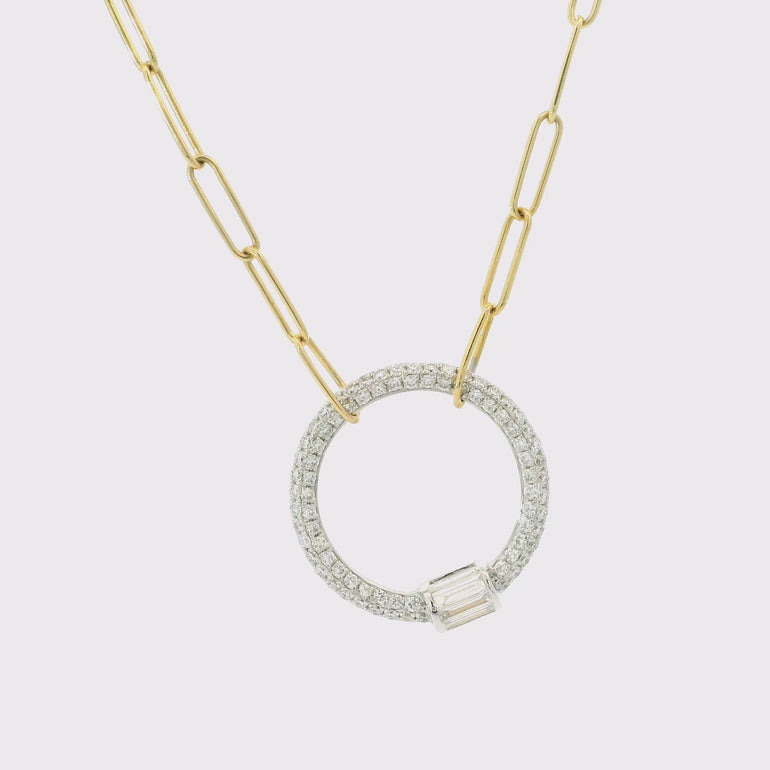 The diamond pin is in white gold attached on a yellow gold paperclip chain. By default, the chain is 45cm. The lock can be closed on any of the links, making it fully adjustable.