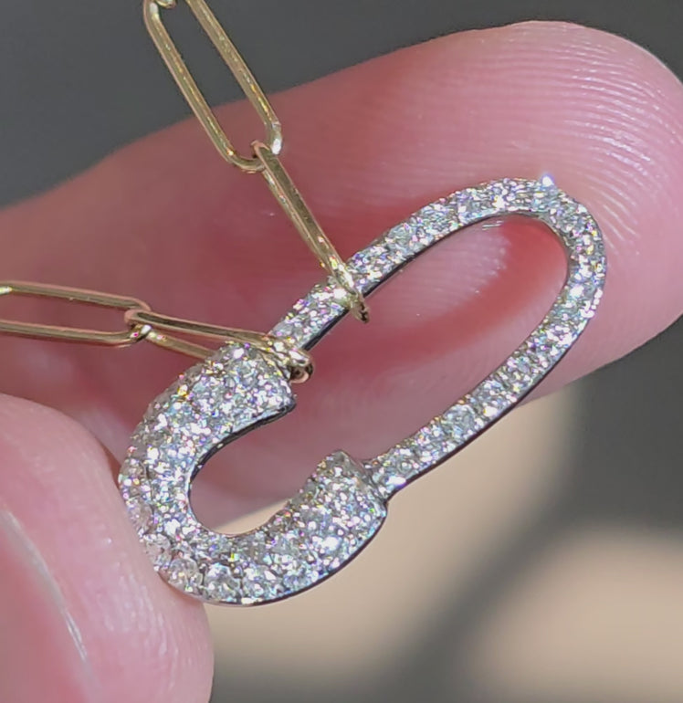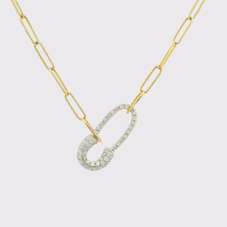 The diamond pin is in white gold attached on a yellow gold paperclip chain. By default, the chain is 45cm. The lock can be closed on any of the links, making it fully adjustable.