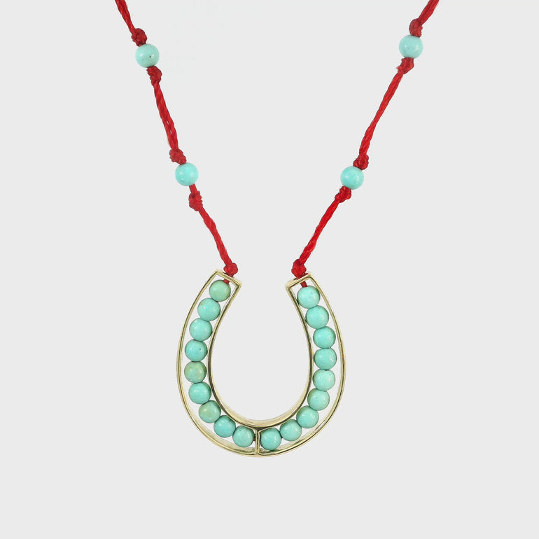 Made out of Turquoise & a red cord. The lock & horseshoe frame make up the mentioned weight.