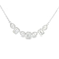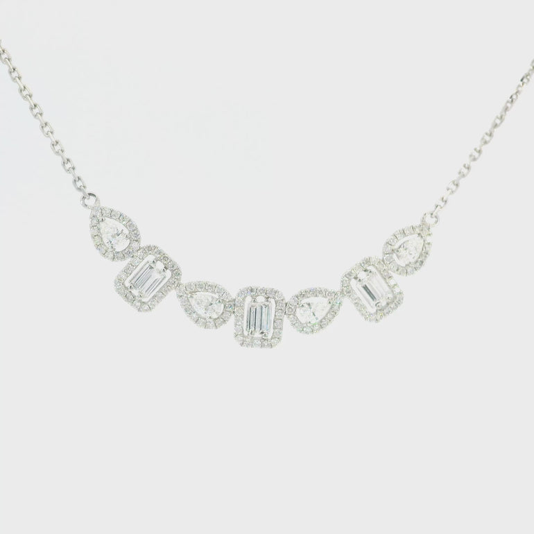 This necklace full pear shapes & two baguette diamonds inside each motif, surrounded by a diamond halo.