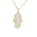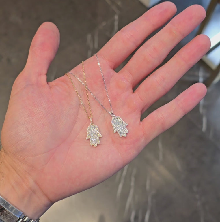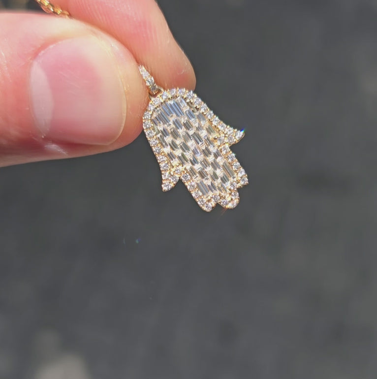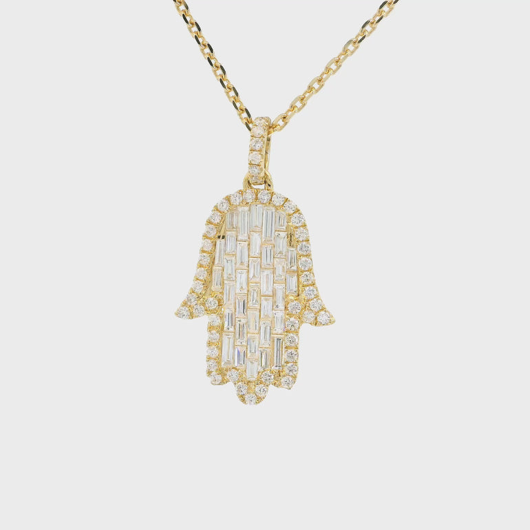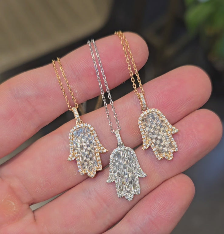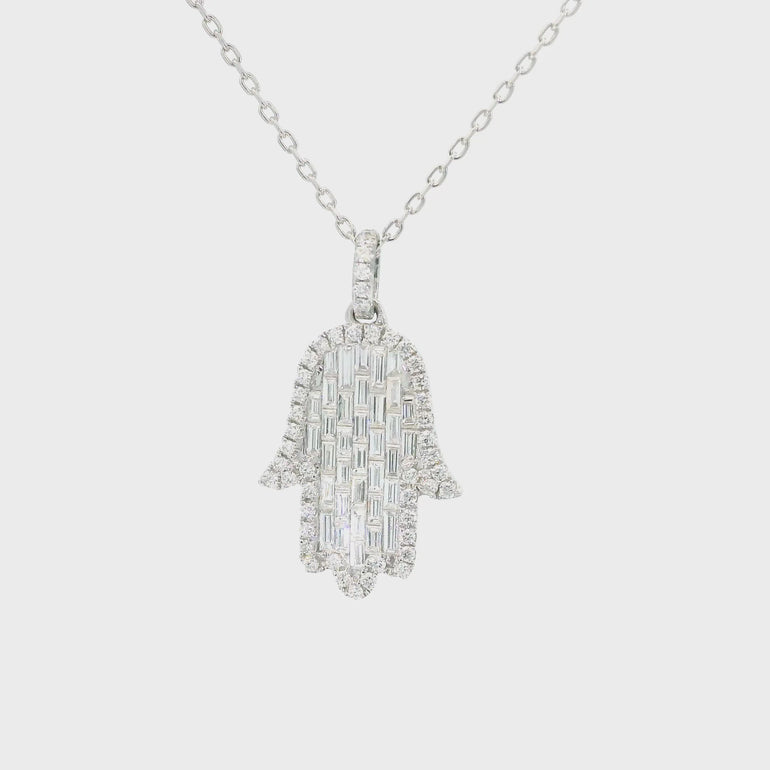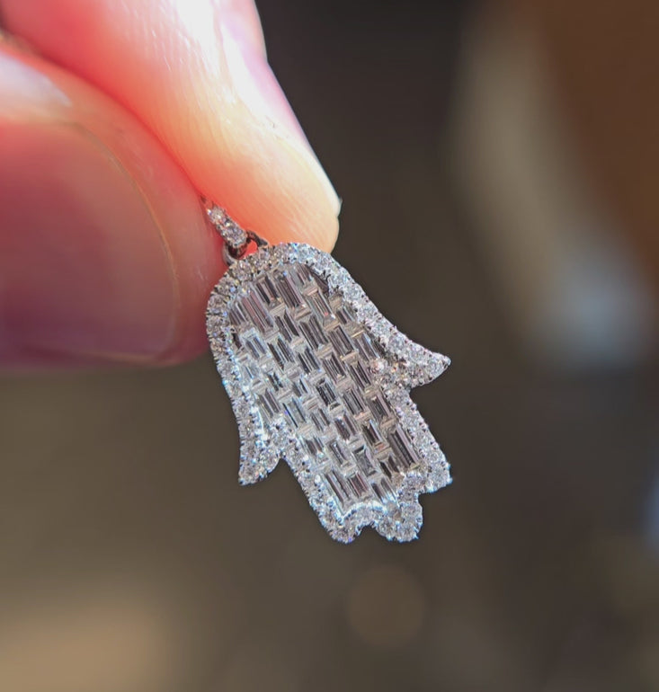The Hamsa Hand is a universal sign of protection, power and strength that dates back to ancient Mesopotamia. Encrusted with baguette diamonds in a setting that resembles